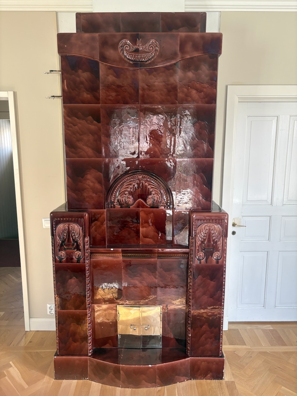 Kuvan punaruskea Rakkolanjoen kaakelitehtaan riikinkukkoaiheinen uuni, suoran seinän malli.